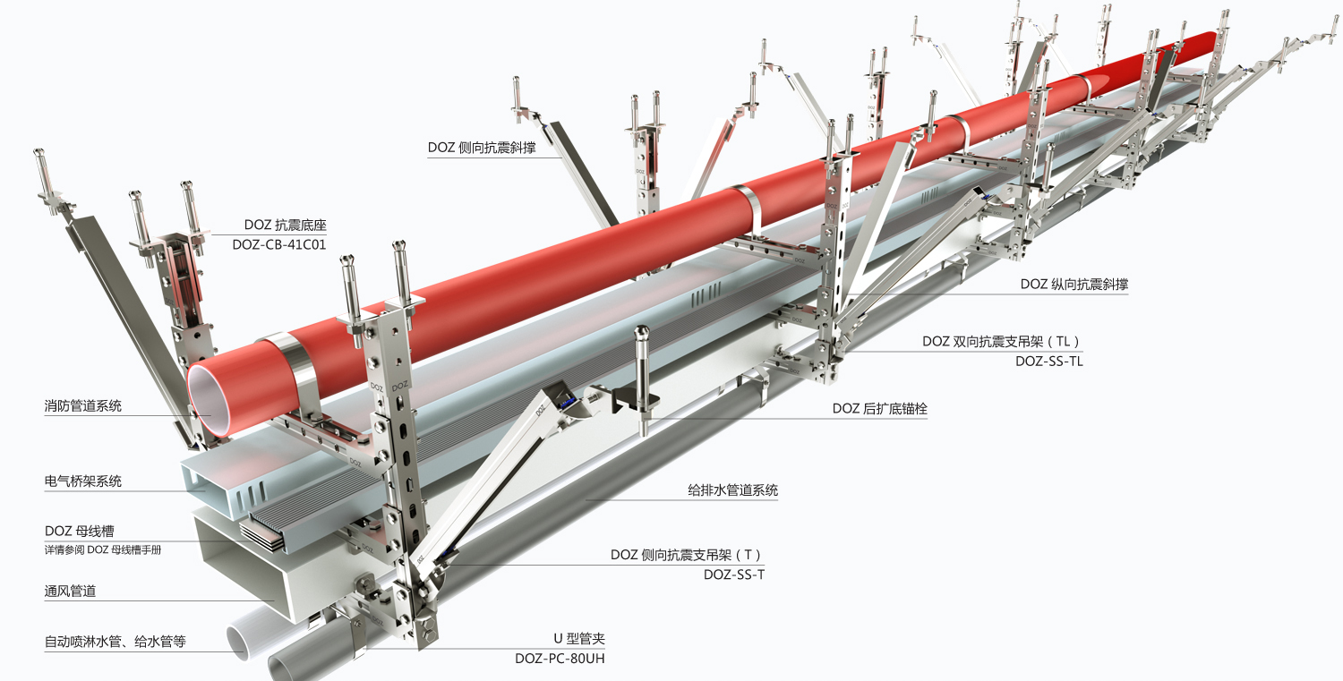 抗震支吊架的工程依据抗震支吊架在地震中可对给排水系统、空调系统、电气管线系统提供充分的保护,所以抗震支吊架在任何时候、任何安装角度都须大于地震力。水平方向的地震负荷可由两个不同方向的抗震支撑承担,即侧向抗震支撑承担侧向负荷,纵向抗震支撑承担纵向负荷。所有抗震支撑须和结构体作可靠连接。抗震支吊与钢筋混凝土框架结构的梁柱板作刚性连接,与钢结构作柔性连接,且须经设计人员验算。